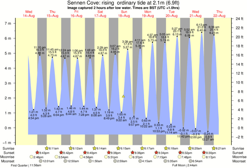 Image captured 2 hours after low water (rising ordinary tide). Tide height was 2.1m (6.9 ft). Range 7.11m (23.3 ft). Toggle tide graph