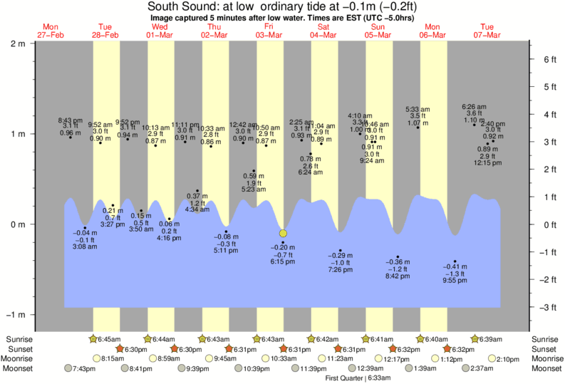 Image captured 5 minutes after low water (at low ordinary tide). Tide height was -0.1m (-0.2 ft). Range 2.68m (8.8 ft). Toggle tide graph