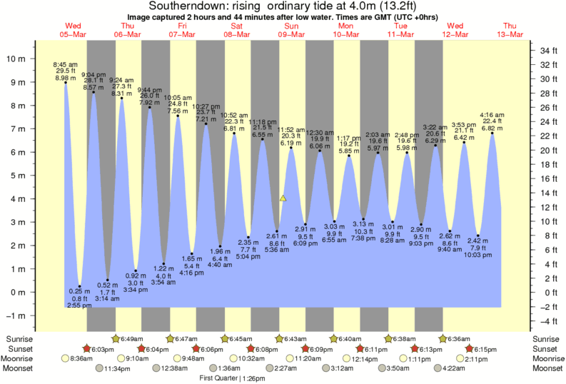 Image captured 2 hours and 44 minutes after low water (rising ordinary tide). Tide height was 4.0m (13.2 ft). Range 10.40m (34.1 ft). Toggle tide graph