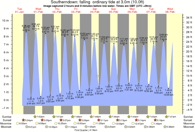 Image captured 2 hours and 8 minutes before low water (falling ordinary tide). Tide height was 3.0m (10.0 ft). Range 10.52m (34.5 ft). Toggle tide graph
