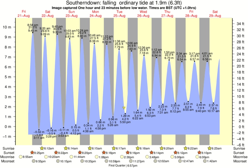 Image captured One hour and 23 minutes before low water (falling ordinary tide). Tide height was 1.9m (6.3 ft). Range 10.66m (35.0 ft). Toggle tide graph