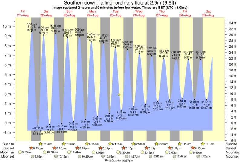 Image captured 2 hours and 9 minutes before low water (falling ordinary tide). Tide height was 2.9m (9.6 ft). Range 10.66m (35.0 ft). Toggle tide graph