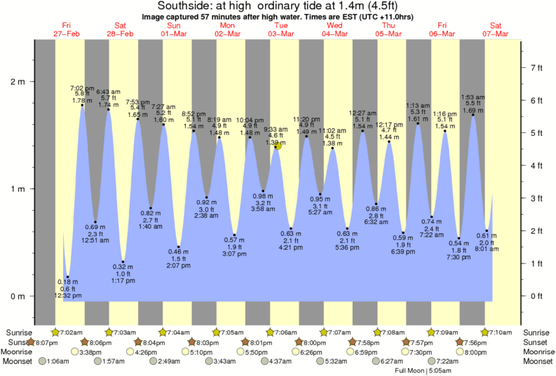 Image captured 57 minutes after high water (at high ordinary tide). Tide height was 1.4m (4.5 ft). Range 2.22m (7.3 ft). Toggle tide graph