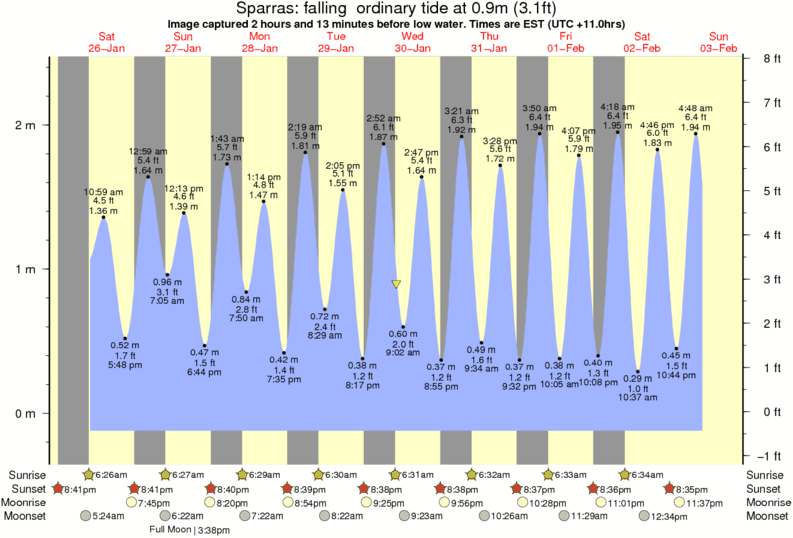 Image captured 2 hours and 13 minutes before low water (falling ordinary tide). Tide height was 0.9m (3.1 ft). Range 2.36m (7.7 ft). Toggle tide graph