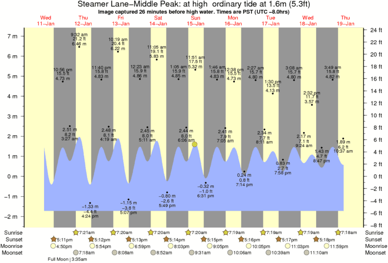 Forecast wind and swell just offshore from Steamer Lane-Middle Peak around the time the photo was taken