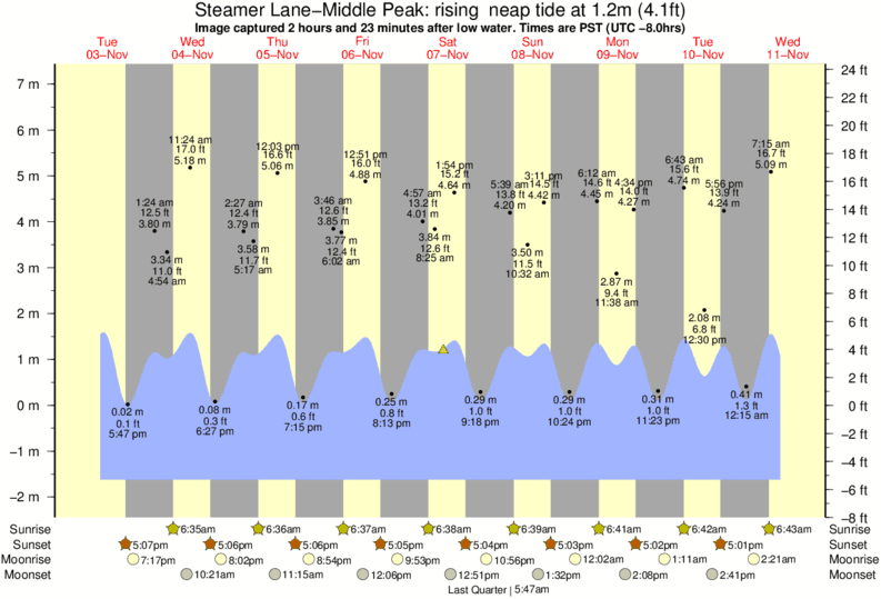 Image captured 2 hours and 23 minutes after low water (rising neap tide). Tide height was 1.2m (4.1 ft). Range 8.24m (27.0 ft). Toggle tide graph