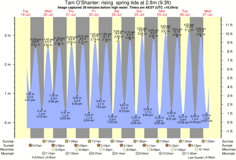 Image captured 39 minutes before high water (rising spring tide). Tide height was 2.8m (9.3 ft). Range 3.47m (11.4 ft). Toggle tide graph