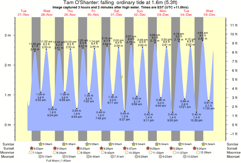 Image captured 3 hours and 2 minutes after high water (falling ordinary tide). Tide height was 1.6m (5.3 ft). Range 3.46m (11.4 ft). Toggle tide graph