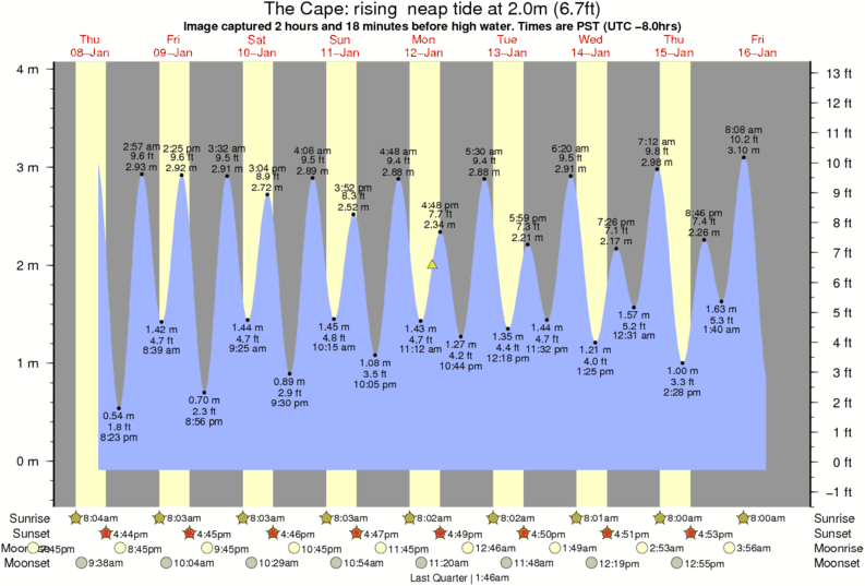 Image captured 2 hours and 18 minutes before high water (rising neap tide). Tide height was 2.0m (6.7 ft). Range 3.79m (12.4 ft). Toggle tide graph