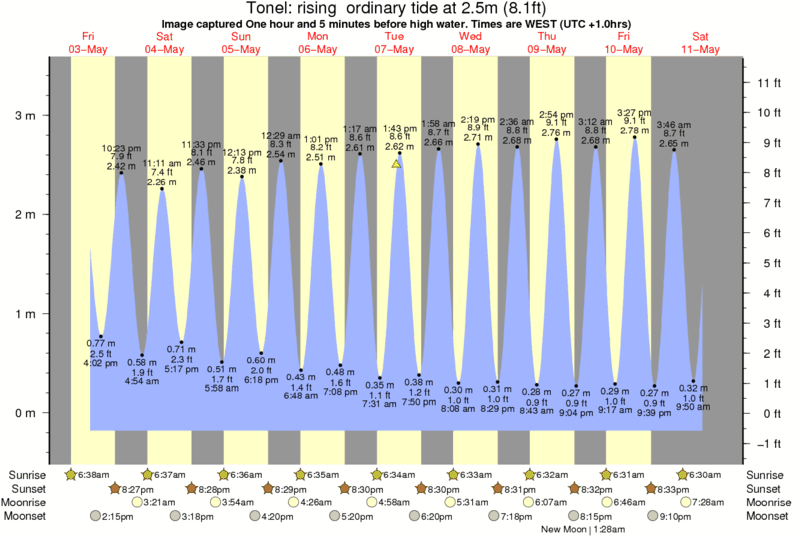 Image captured One hour and 5 minutes before high water (rising ordinary tide). Tide height was 2.5m (8.1 ft). Range 3.43m (11.3 ft). Toggle tide graph