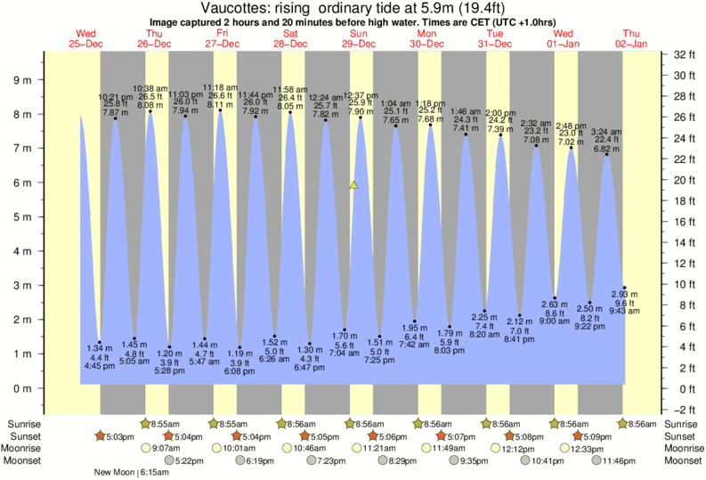 Image captured 2 hours and 20 minutes before high water (rising ordinary tide). Tide height was 5.9m (19.4 ft). Range 8.84m (29.0 ft). Toggle tide graph