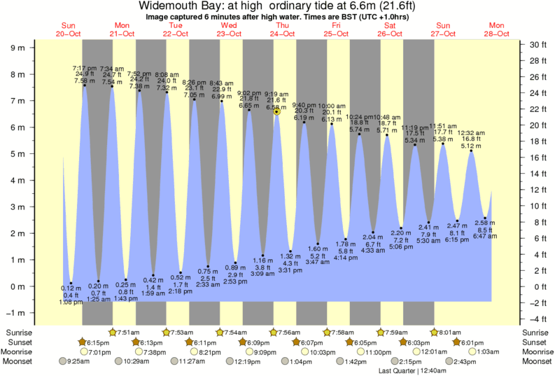 Image captured 6 minutes after high water (at high ordinary tide). Tide height was 6.6m (21.6 ft). Range 8.98m (29.5 ft). Toggle tide graph