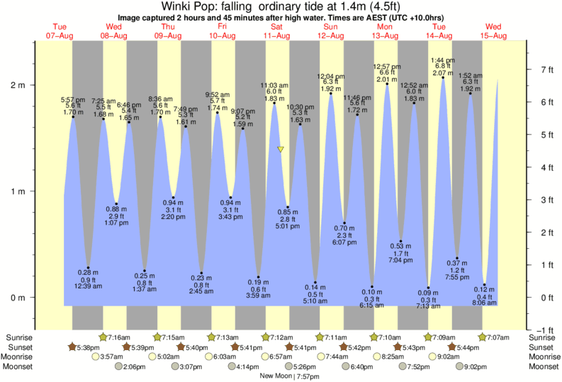 Image captured 2 hours and 45 minutes after high water (falling ordinary tide). Tide height was 1.4m (4.5 ft). Range 2.27m (7.4 ft). Toggle tide graph